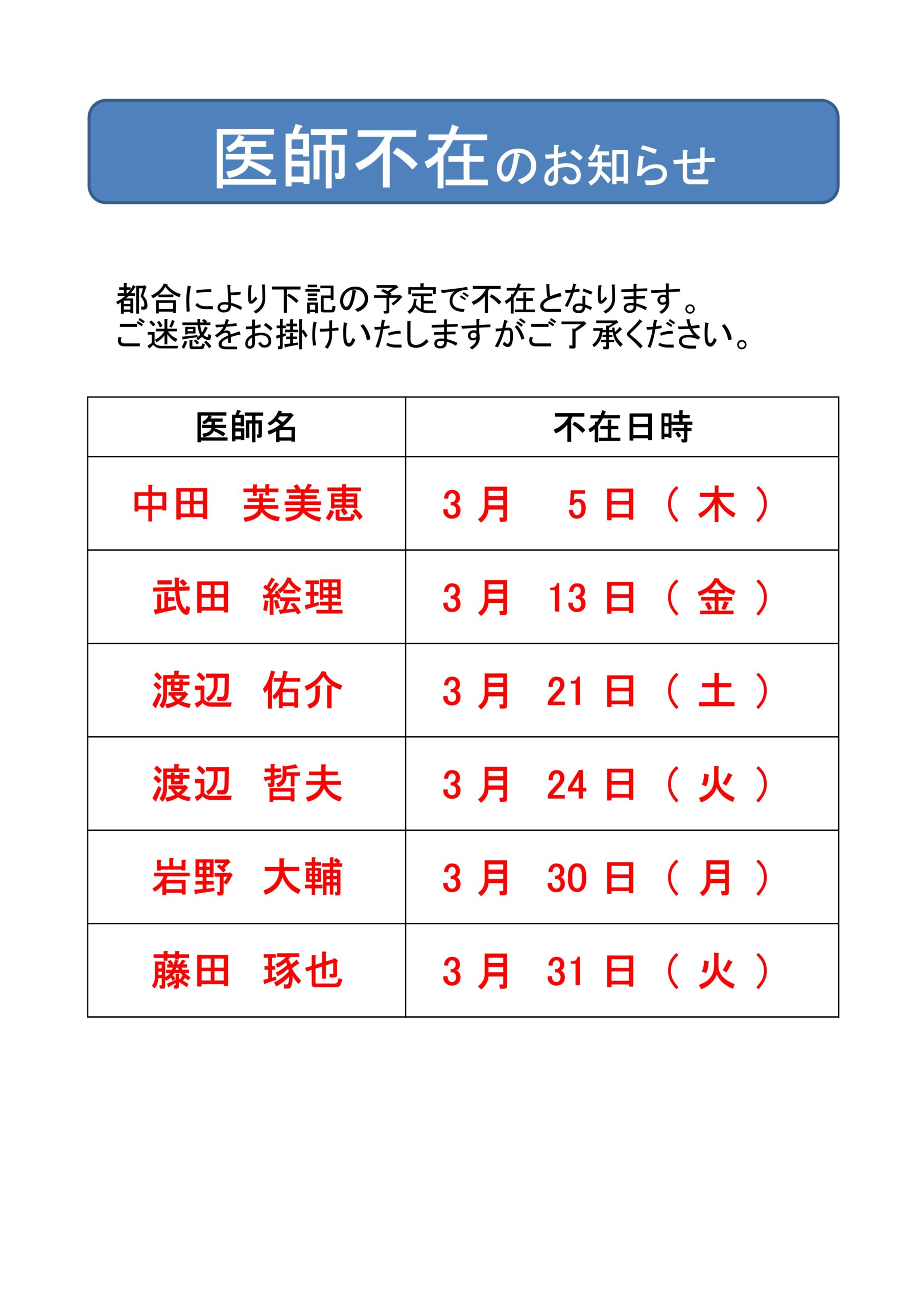 医師不在のお知らせ 2026年3月