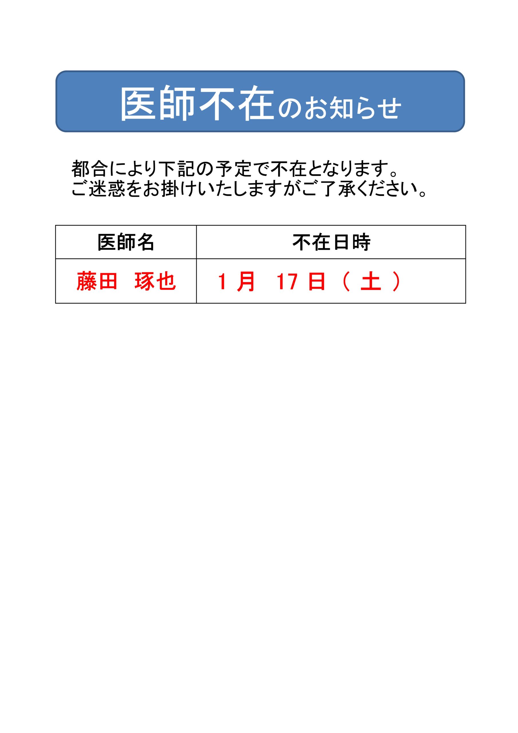 医師不在のお知らせ 2026年1月